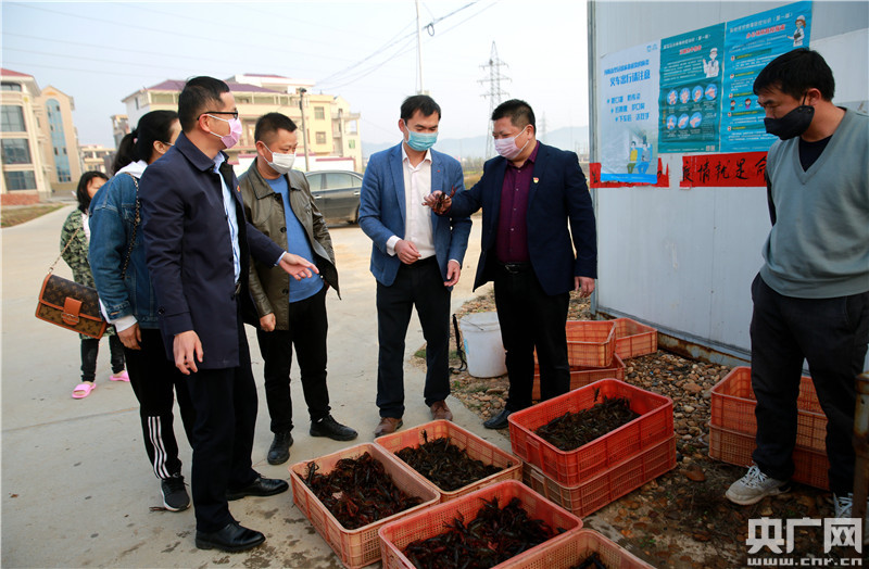 2020年2月26日,江西省吉安市吉水縣楓江鎮(zhèn)楊家塘村龍升漁業(yè)基地,駐村干部王鋒(左二)陳海龍(右三)正在一起查看小龍蝦苗生長情況。