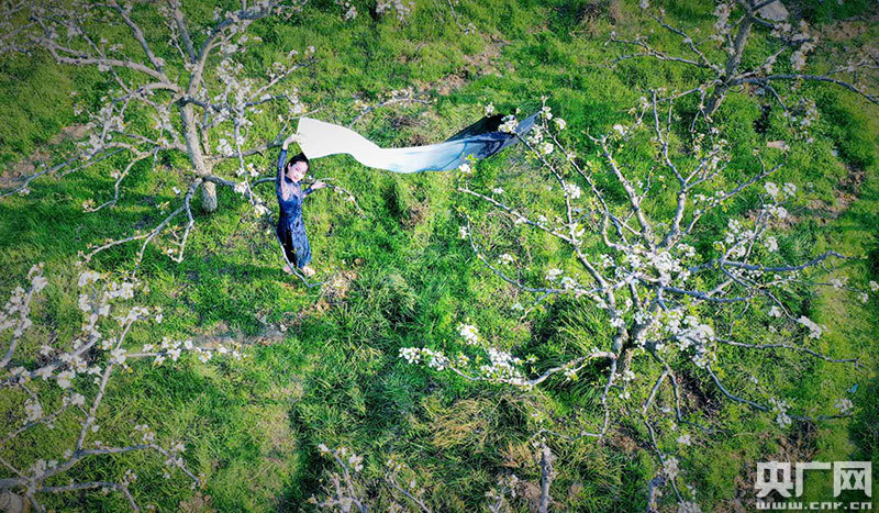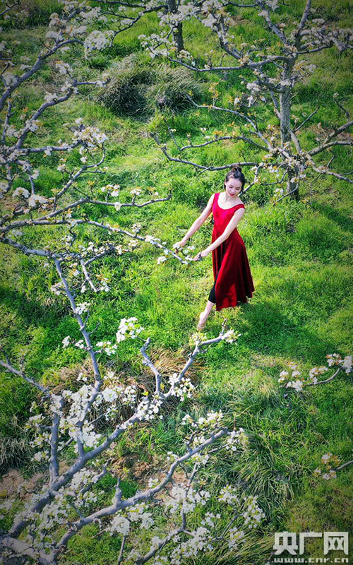 舞蹈愛好者在梨花林里,翩翩起舞(央廣網(wǎng)發(fā) 通訊員田俊/攝)