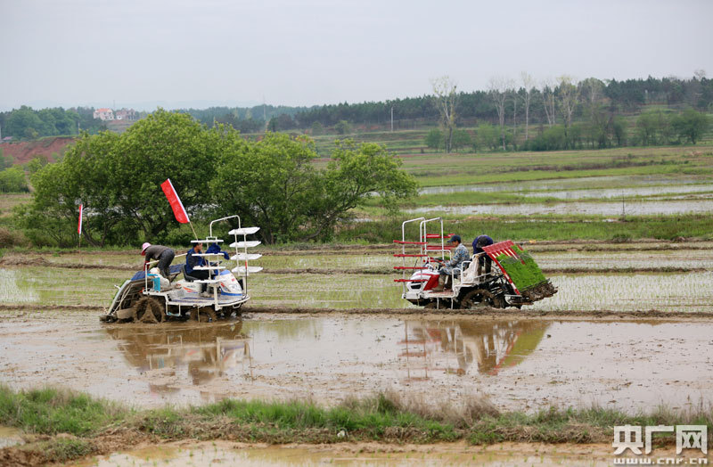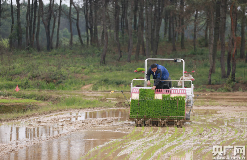 4月14日,江西省吉安市吉水縣尚賢鄉(xiāng)田螺邊村農(nóng)機來回穿梭,該縣中波農(nóng)機服務隊的操作手正駕駛著插秧機進行春播。