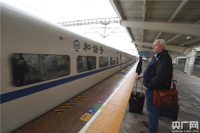 國外友人在列隊等待和諧號停穩(wěn)(張玉 攝)
