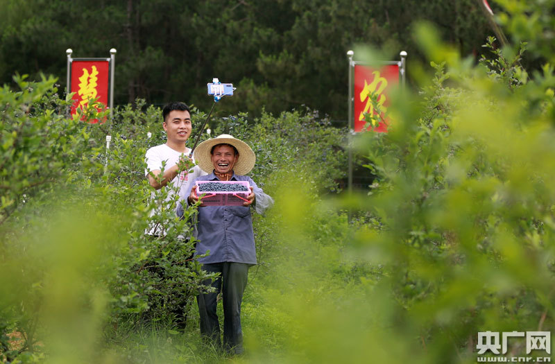 駐村幫扶干部廖晨(左)正在與貧困戶一起錄制抖音在線銷售藍莓