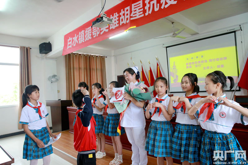胡星在為白水鎮(zhèn)的中小學(xué)生講敘自己親身經(jīng)歷的武漢抗疫故事