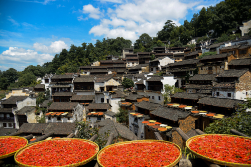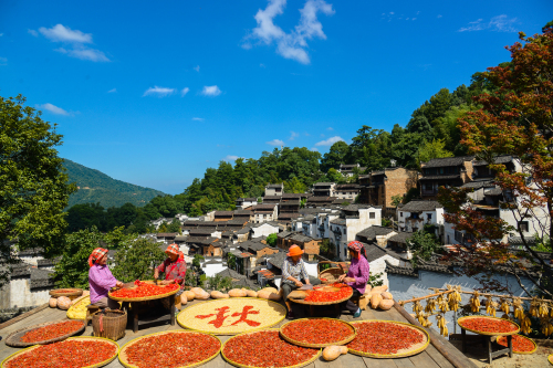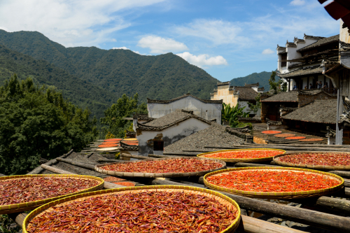 立秋至,曬秋忙!江西省婺源縣篁嶺人家正式進(jìn)入了忙碌的曬秋時(shí)節(jié)。紅的辣椒,黃的玉米,綠的豆角喜迎豐收,忙碌的除了搶收搶曬的曬秋大媽,還有換了一茬又一茬的曬匾。農(nóng)作物在各家屋頂一一鋪曬開(kāi)來(lái),鱗次櫛比的徽派古建穿上五彩的新衣,宛如一幅豐收的畫(huà)卷。