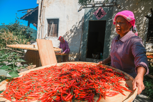 立秋當(dāng)天,篁嶺曬秋大媽們忙著洗曬辣椒,在五桂堂觀景臺(tái)用辣椒擺出“秋”字喜迎立秋到來(lái),也吸引眾多游客駐足拍照。篁嶺古村也舉行了懸秤稱人,貼秋膘,吃粿湯,啃秋等傳統(tǒng)習(xí)俗。