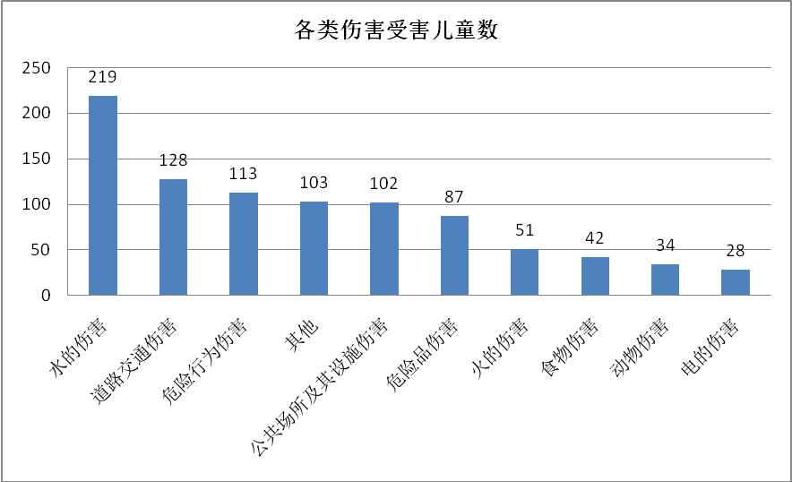 據(jù)告統(tǒng)計,兒童傷害總?cè)藬?shù)為907人,其中死亡485人,占總數(shù)的53.5%。其中水的傷害、道路交通傷害、危險行為傷害是造成兒童死亡人數(shù)最多的3類傷害,死亡人數(shù)占該類傷害受害人數(shù)比例分別達到75.8%、57.8%、55.8%。