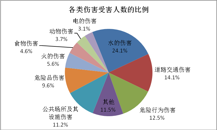 在兒童意外傷害的類別上,報告顯示,隨著年齡增加,傷害逐漸向少數(shù)幾類集中,值得注意的是,每一個年齡段都存在受到水的傷害的情形,而且排名始終靠前?傮w數(shù)據(jù)顯示,受水傷害的兒童人數(shù)達219人,占受害兒童總數(shù)24.1%,遠遠高于其他兒童傷害。具體見下圖: