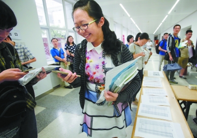 記者在光華管理學院的報到現(xiàn)場見到了今年北京的高考理科狀元劉智昕。梳著馬尾辮、穿著裙子的她抱著一大堆報到資料、書籍,還得騰出一只手用手機掃學院的“北大光華本科項目”微信二維碼,“有些忙亂,但是很興奮!彼χf,父母在宿舍里幫著收拾東西,自己先過來學院辦一些手續(xù)。