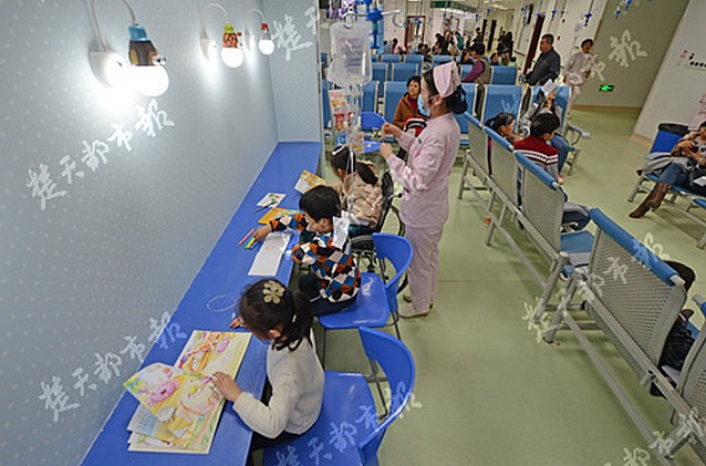 在一排可愛的驢頭護(hù)眼燈下,幾名小朋友掛著吊瓶端坐在輸液室的一角,趴在桌前或閱讀或做作業(yè)……這是武漢市第三醫(yī)院光谷院區(qū)兒科門診內(nèi)的一幕。今天,該院在武漢率先開設(shè)兒科輸液室書香一角,方便學(xué)生打針時(shí)兼顧學(xué)習(xí),堪稱醫(yī)院里的“吊瓶班”。