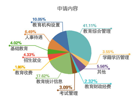報告顯示,1月1日至12月31日,共收到公民、法人和其他組織通過各種形式提出的信息公開申請647件,較2014年的281件增長了130%。從申請的主體看,公民個人提出的申請626件、其他組織提出的申請21件。從申請方式看,當(dāng)面申請16件,占2.47%;以電子郵件方式申請31件,占4.79%;以紙質(zhì)信函方式申請65件,占10.05%;以在線提交方式申請535件,占82.69%。涉及教育綜合管理的266件,占41.11%;涉及教育統(tǒng)計信息的114件,占17.62%;涉及教育機(jī)構(gòu)設(shè)置的65件,占10.05%;涉及人事待遇的42件,占6.49%;涉及招生就業(yè)的28件,占4.33%;涉及基礎(chǔ)教育的26件,占4.02%;涉及學(xué)籍學(xué)歷管理的23件,占3.55%;涉及考試管理的20件,占3.09%;涉及教育財政經(jīng)費(fèi)的15件,占2.32%;涉及教育收費(fèi)的12件,占1.86%;其他36件,占5.56%。申請內(nèi)容涉及教育部20個業(yè)務(wù)司局。