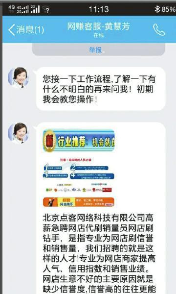一天前,陳先生登錄58同城網(wǎng)站,向4家公司發(fā)出了兼職意向。當(dāng)天中午,他收到了一份面試邀請的短信,按照提示,添加了客服黃慧芳的QQ號后,一個女性話務(wù)員的頭像彈出,穿著白襯衣,扎起馬尾,顯得精神抖擻。第一句話便是讓“了解工作流程”,接著,客服發(fā)來一段幾百字的說明。