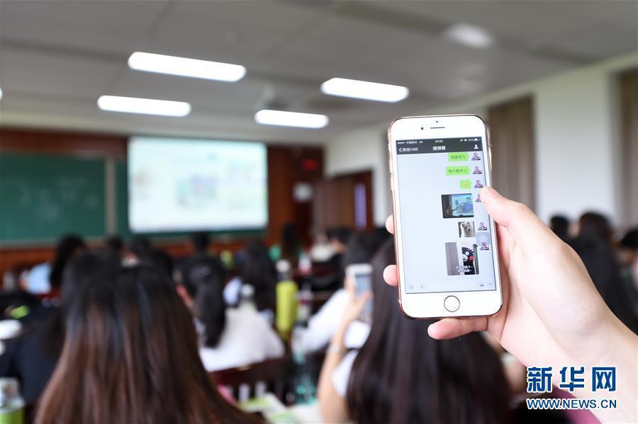 5月24日,一位同學(xué)在展示其通過(guò)微信“彈幕”發(fā)給老師和投影儀的內(nèi)容。重慶大學(xué)新聞學(xué)院大二選修課《網(wǎng)絡(luò)與新媒體》放棄傳統(tǒng)課前點(diǎn)名方式,通過(guò)微信對(duì)學(xué)生進(jìn)行定位簽到。課程通過(guò)微信記錄下的定位簽到記錄和課堂測(cè)驗(yàn)記錄都將在期末折算成平時(shí)成績(jī)。該選修課授課老師還通過(guò)微信進(jìn)行課堂教學(xué),允許學(xué)生在課堂上隨時(shí)通過(guò)微信“彈幕”提問(wèn)并與老師互動(dòng)。新華社記者 唐奕 攝 圖片來(lái)源:新華網(wǎng)