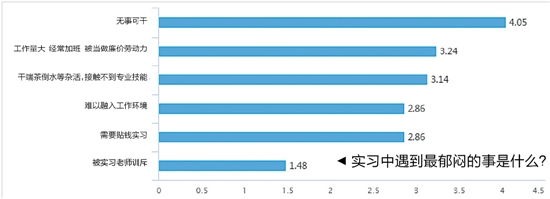在各種各樣的實(shí)習(xí)狀態(tài)中,“無事可干”、“工作量大,經(jīng)常加班,被當(dāng)作廉價(jià)勞動力”和“干端茶倒水等雜活,接觸不到專業(yè)技能”榮登吐槽榜前三位。