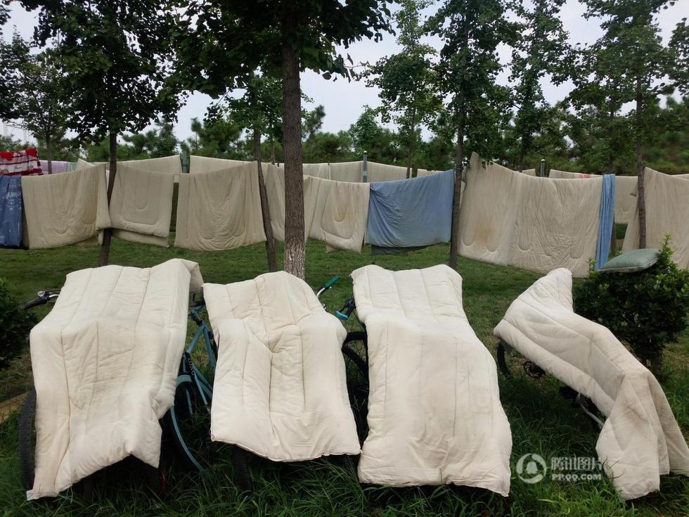2016年8月21日,山東聊城,一高校開學(xué)季現(xiàn)“曬被潮”,返校的大學(xué)生們?cè)谒奚針乔啊⒘酪吕K上、球場(chǎng)上、健身器材上、草坪上、圍欄上、陽(yáng)臺(tái)上晾滿了花花綠綠的的被褥,遠(yuǎn)望被褥鋪天蓋地,十分壯觀。