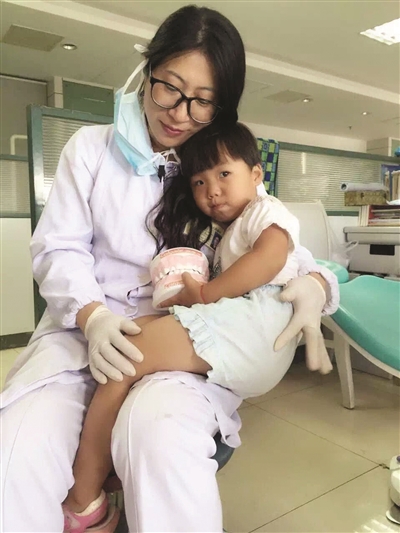 “別哭,奶奶抱!”就在這時(shí),囗腔診室主任醫(yī)師孔銳伸出了雙臂,溫柔地招呼她走過來。同時(shí)孔主任從桌上拿了一個(gè)牙齒模型玩具遞到她的手中,并趕緊解開了口罩,讓小女孩看見她慈愛的表情,親切地笑著再次向她伸出雙臂。