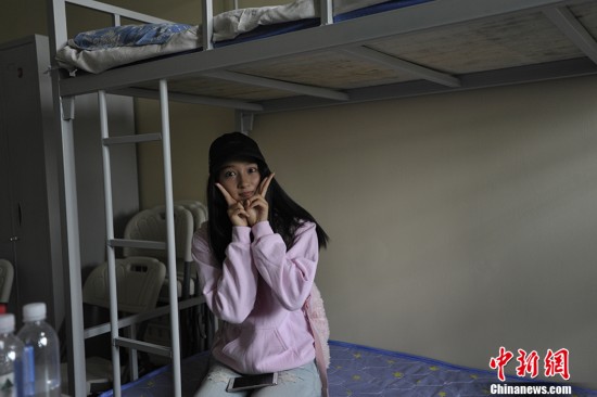 9月4日,“國民閨女”關(guān)曉彤身穿一襲粉色帽衫,現(xiàn)身北京電影學(xué)院報(bào)到,遭媒體圍堵。圖為關(guān)曉彤在寢室中。 中新網(wǎng)記者 李泊靜攝