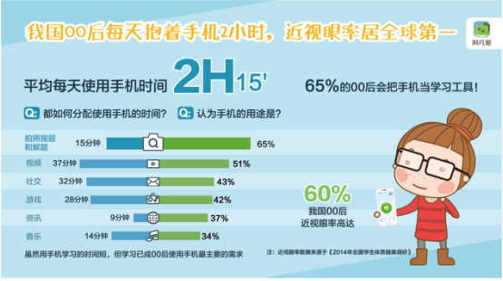 著名雕塑家羅丹曾說“世界上并不缺少美,而是缺少發(fā)現(xiàn)美的眼睛”,可放在當(dāng)今中小學(xué)生群體中,缺少的卻是一副近視眼鏡。阿凡題《學(xué)習(xí)行為報告》顯示,我國00后近視眼率高達60%,居全球第一。而他們平均每天使用手機時間長達2小時15分鐘,其中平均刷視頻37分鐘、網(wǎng)上聊天32分鐘、打游戲28分鐘、上網(wǎng)拍照搜題15分鐘,聽音樂和看新聞則分別占用14分鐘和9分鐘。但調(diào)研顯示,使用時間長短并不與00后的使用需求直接相關(guān)。如雖然平均每天只花15分鐘進行拍照搜題搞定作業(yè),卻有65%的00后都會選擇把手機當(dāng)作學(xué)習(xí)工具,換言之,學(xué)習(xí)已成為00后使用手機最主要的需求。