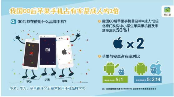阿凡題報告指出,在擁有手機的00后當(dāng)中,小米、華為、蘋果順利躋身他們最常使用手機品牌TOP3。更值得注意的是,對比蘋果與安卓手機的出貨量情況,我國00后蘋果手機的普及率已是成人的2倍,在北京門頭溝地區(qū)中小學(xué)生蘋果手機普及率甚至高達50%!