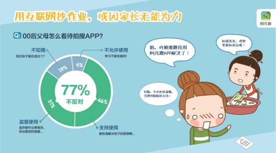 面對00后的作業(yè)難題,更多家長有苦難言,即使他們這一代受大專以上教育水平的人數(shù)比10年前增長近3倍,但是對于輔導(dǎo)孩子功課這件事,依然是力不從心,所以,支持或陪伴孩子使用互聯(lián)網(wǎng)學(xué)習(xí)工具成為了他們的主要選擇。據(jù)統(tǒng)計,77%的家長不反對使用拍搜APP,其中46%的家長認為“能快速解決孩子的困惑”;而考慮到未成年人自覺性欠缺,31%的家長選擇監(jiān)督和陪伴使用;不允許孩子使用拍照搜題的家長僅為4%。