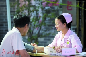 10月4日,黃埔古村,護(hù)士在義診中為市民量血壓。 廣州日?qǐng)?bào)記者王燕攝
