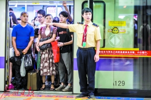 10月7日,地鐵工作人員在站臺(tái)上維持秩序。廣州日?qǐng)?bào)記者陳憂子攝