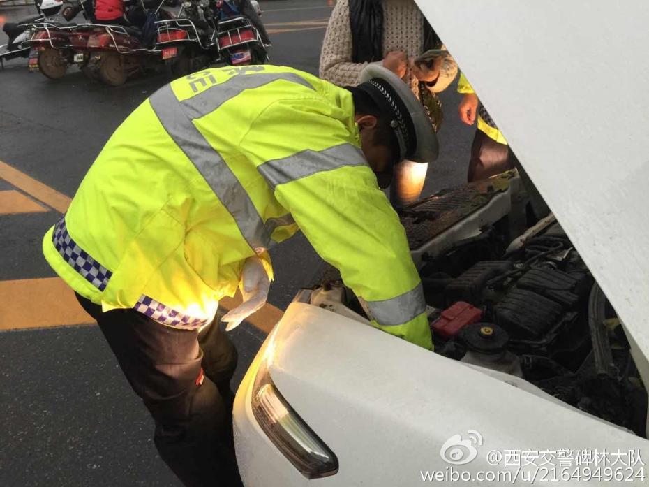 近日,一輛小轎車停到西安南門內(nèi)盤道,司機說一路上聽見車?yán)锖孟裼胸埖慕新暋?圖片來源:西安市公安局交通警察支隊碑林大隊官方微博)