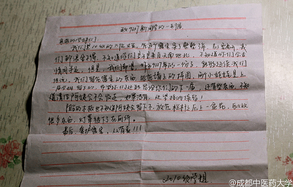 近日,成都中醫(yī)藥大學(xué)一間寢室的同學(xué)們突然發(fā)現(xiàn)一封來自10級學(xué)姐們的信,信中說到,她們在寢室留下了拼圖、娃娃等物品,而這也是上一屆學(xué)姐留下的,可以說的“寢室傳統(tǒng)”,讓這間寢室的新主人們讀完之后十分感動。希望她們能夠如愿找到這些可愛的學(xué)姐。