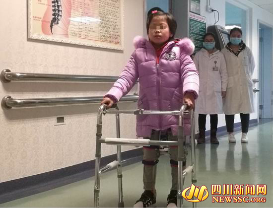 今日上午10點(diǎn),在成都溫江一家醫(yī)院的過(guò)道上,琴琴(化名)在不用醫(yī)生幫助地情況下,自己帶上護(hù)具練習(xí)走路。
