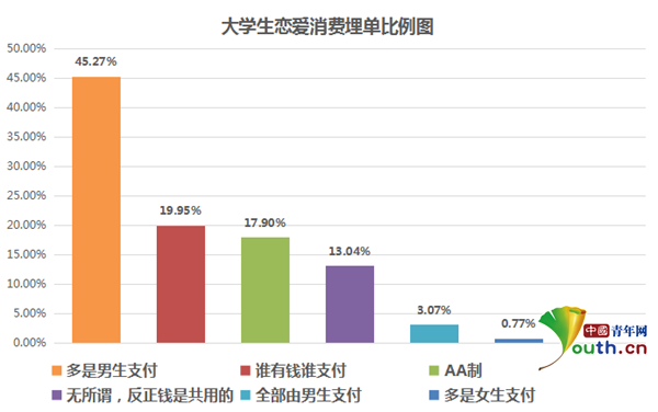 在購物消費(fèi)時(shí),由誰埋單呢?根據(jù)中國青年網(wǎng)調(diào)查顯示,“多是男生支付”比例最高,占45.27%;其次是“誰有錢誰支付”和“AA制”,分別占19.95%、17.9%;“全部由男生支付”占3.07%,“多是女生支付”僅占0.77%,“全部由女生支付”則無人選擇;此外,還有13.04%的學(xué)生選擇“無所謂,反正錢是共用的”。