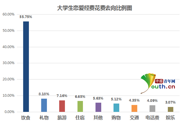 在戀愛消費(fèi)中,什么占最大比例呢?“買吃的是最主要的消費(fèi)吧。”新鄉(xiāng)學(xué)院的王鵬飛在回答中國青年網(wǎng)記者提問時(shí)表示,剛戀愛一個(gè)月,為了買好吃的已經(jīng)花掉了自己和女朋友1600元。根據(jù)中國青年網(wǎng)調(diào)查,55.75%的大學(xué)生認(rèn)為在戀愛消費(fèi)中“飲食花銷最大”。