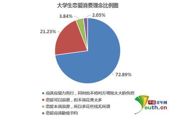 根據(jù)中國青年網(wǎng)調(diào)查數(shù)據(jù)顯示,在戀愛消費(fèi)理念方面,有72.89%的學(xué)生認(rèn)為雙方“應(yīng)該量力而行,同時(shí)也不給對方增加太大的負(fù)擔(dān)”,其次為“戀愛可以浪漫,但不該花費(fèi)太多”占21.23%,僅有3.84%的學(xué)生認(rèn)為“戀愛本該浪漫,所以多花些錢無所謂”。由此可見,大學(xué)生戀愛消費(fèi)理念相對理性。