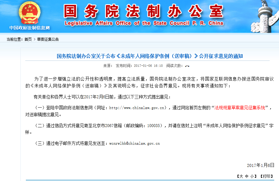 “凡法始立必有病”。正如天空海洋因風(fēng)浪而動,網(wǎng)絡(luò)的誕生使未成年人權(quán)益保護(hù)遭遇新情況。據(jù)統(tǒng)計,截至2016年6月,我國網(wǎng)民規(guī)模達(dá)7.1億,其中青少年網(wǎng)民(19歲以下)約占全體網(wǎng)民的23%,達(dá)1.6億。這個新興領(lǐng)域里,未成年人雖是原住民,卻也遭受著權(quán)利受損、個人隱私泄露、網(wǎng)絡(luò)詐騙、網(wǎng)絡(luò)欺凌、上網(wǎng)成癮等一系列問題。同時,不良網(wǎng)絡(luò)信息和低俗網(wǎng)絡(luò)游戲?qū)η嗌倌甑母g和侵害,也從一定程度上致使未成年人網(wǎng)絡(luò)犯罪頻發(fā),網(wǎng)絡(luò)暴力愈加嚴(yán)重。青少年是初升的紅日,是家國的希望,不爭的事實面前,制定《未成年人網(wǎng)絡(luò)保護(hù)條例》迫在眉睫,更是無數(shù)青少年和家長的心聲。