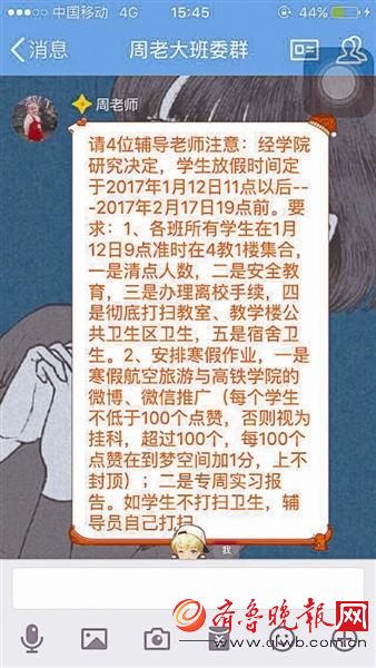 昨日,有網(wǎng)友爆料了一則高校奇葩寒假作業(yè)的消息引發(fā)關(guān)注。四川的一所高校給學(xué)生布置一項(xiàng)“特殊”的寒假作業(yè),作業(yè)的內(nèi)容是要求學(xué)生在寒假推廣該校的官方公眾號,并且要求有“點(diǎn)贊”,對于“點(diǎn)贊”數(shù)量還有特定的要求。對此,網(wǎng)友表示無法理解學(xué)校的想法。校方稱,不知情或?yàn)閷W(xué)院領(lǐng)導(dǎo)的個(gè)人行為。