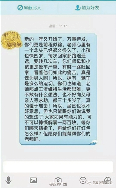 爆料帖中同時上傳了多張聊天記錄,其中一張顯示:“新的一年又開始了,萬事待發(fā),你們更是前程似錦。老師心里有個念頭已經(jīng)很久了,小孩也快四歲了,每次回家都路途遙遠(yuǎn),要轉(zhuǎn)幾次車,你們師母和小孩更是暈車嚴(yán)重,有時一路吐回家,看看他們?nèi)绱送纯,真是愧為男人啊!所以,擁有一輛車是多么的迫切。你們也知道老師那些工資維持生活都很艱難,更不敢有什么想法,也不好向父母親人求助,都三十多歲了,真的羞于啟齒!所以,雖然也很不好意思,但是也只能跟你們說說我的想法了:大家如果有能力的,可不可以慷慨解囊一兩百塊,等你們哪天結(jié)婚了,再給你們打紅包怎么樣?但愿你們能幫幫你們的老師吧。”