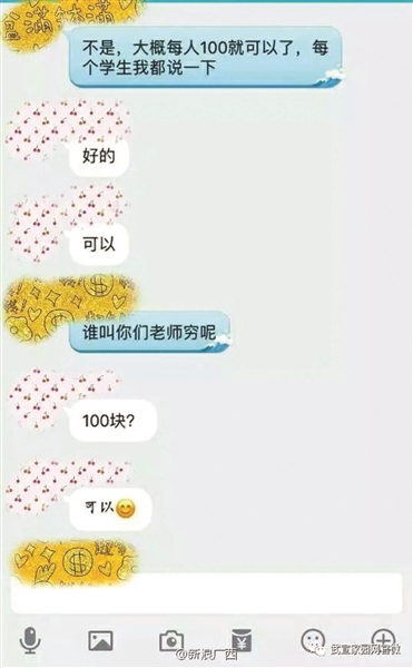 在被曝光的聊天記錄中,該老師曾表示,“大概每人100就可以了,每個學(xué)生我都說一下。”并解釋說,“誰叫你們老師窮呢?”聊天記錄顯示,群內(nèi)多名學(xué)生回復(fù)稱,“可以!