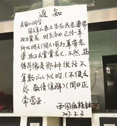 由于承包的學(xué)校香辣鍋生意火爆,侯高紅平時(shí)沒時(shí)間回家,一到放假,相親就頻繁。“食堂管理嚴(yán)格,除寒暑假外,要暫停營(yíng)業(yè),必須請(qǐng)假,并在檔口上貼通知”。然而,侯高紅中秋相親失敗,還得繼續(xù)相親,之后又結(jié)婚生子,于是就有了2015年圣誕節(jié)、去年10月底、今年3月初的那3張停業(yè)通知單!巴2幌聛戆。嘤H成功后,事兒就多了”。