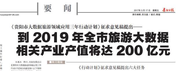 2017年3月16日,貴陽市旅發(fā)委出臺(tái)《貴陽市大數(shù)據(jù)旅游領(lǐng)域應(yīng)用三年行動(dòng)計(jì)劃》征求意見稿。征求意見稿提出,創(chuàng)新旅游行業(yè)管理和旅游公共服務(wù)模式,到2019年,全市打造智慧旅游示范企業(yè)3至5個(gè),引進(jìn)和培育大數(shù)據(jù)旅游企業(yè)5至10家,旅游大數(shù)據(jù)相關(guān)產(chǎn)業(yè)產(chǎn)值將達(dá)200億元,旅游業(yè)態(tài)逐步向綜合性、融合性轉(zhuǎn)型。