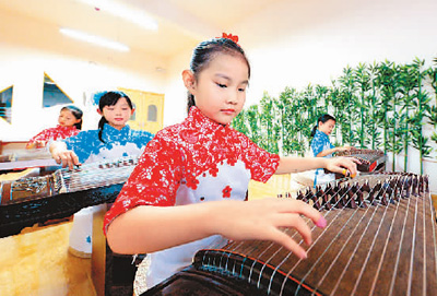 在河北省邯鄲市邯山區(qū)美的小學(xué),學(xué)生在“傳統(tǒng)文化進(jìn)校園”系列活動(dòng)中彈奏古箏。王 曉攝(新華社發(fā))