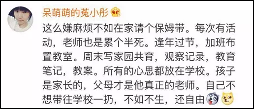 不過(guò),有家長(zhǎng)反對(duì)幼兒園親子活動(dòng)太多的,就有家長(zhǎng)認(rèn)為,幼兒園的活動(dòng)應(yīng)該更豐富一點(diǎn),明明準(zhǔn)備好了給孩子過(guò)節(jié)日,結(jié)果學(xué)校沒(méi)有安排也是很心塞。