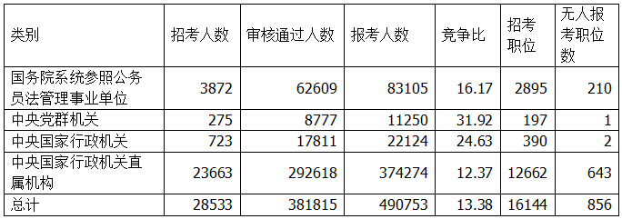 國稅是招錄大戶,目前共有19萬人通過審核,共有24萬人報名,競爭比為11:1,仍有367個職位無人報考。鐵路公安審核通過人數(shù)位居第二,目前有2.5萬人通過審核,競爭比為16:1。值得關(guān)注的是,國家物資儲備局雖然招錄人數(shù)不是很高,僅有51人,但目前有4236人報名,3554人通過審核,競爭比高達(dá)70:1。
