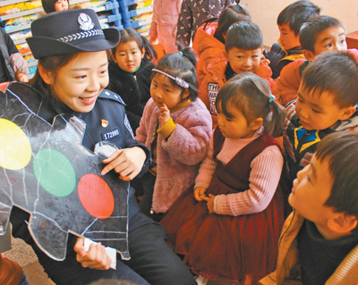 圖為1月15日,派出所民警在下浦幼兒園教小朋友認(rèn)識“紅綠燈”。