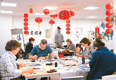 在比利時(shí)布魯塞爾的孔子學(xué)院,學(xué)員們練習(xí)中國(guó)書法。新華社記者葉平凡攝