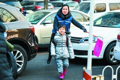 昨晨,中關(guān)村三小南校區(qū)門前,家長志愿者正在幫助小學(xué)生過馬路。記者 鄧偉攝