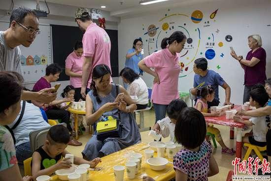 5月26日,周六,北京市海淀區(qū)綺美大廈,一家幼小銜接教育機構的活動室內,孩子和家長在老師的指導下制作蛋糕杯。據(jù)介紹,這座大廈里扎堆兒著30余家教育培訓機構,每周有五六千名孩子來上課。