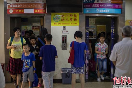 周末,孩子們背著印有培訓機構Logo的背包,里面放著白色的跆拳道服或粉紫色的舞蹈裙;或者一手拎著裝有奧數(shù)卷子、英文教材的布袋,一手被步履匆匆的爸媽拉著,從已經(jīng)停滿汽車看似無處下腳的路口現(xiàn)身,涌入綺美大廈的兩臺電梯,2到6層的電梯按鈕被全部按亮。