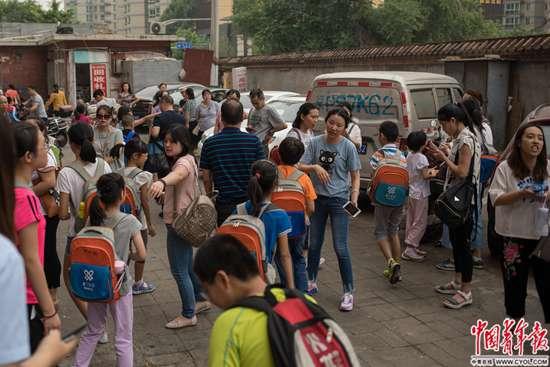 中午,下課的孩子和等待的家長聚集在大廈側門。