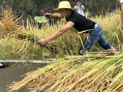 鐮刀、草帽、雨靴、防水服……9月11日,在四川大學(xué)錦城學(xué)院(以下簡(jiǎn)稱“川大錦城”)的農(nóng)場(chǎng)里,正值中午,幾十名同學(xué)卻在農(nóng)田里麻利地干起了農(nóng)活,割水稻、打谷子、鋤地……大伙分工明確,忙得熱火朝天。