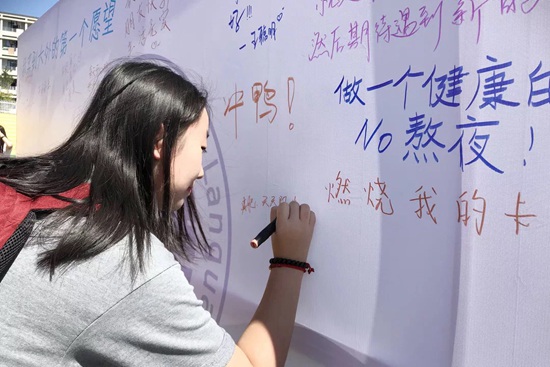 大連外國(guó)語(yǔ)大學(xué)新生在簽名墻上簽字。大連外國(guó)語(yǔ)大學(xué)融媒體中心 羅斕/攝