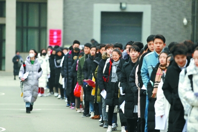 早上8點(diǎn),京城飄起了雪花,位于南鑼鼓巷的中戲東城校區(qū)前,等待入場的考生已經(jīng)排起幾十米的長隊(duì)。今天是正月初八,年味兒還未退去,不少考生告訴記者,這個(gè)春節(jié)假期他們選擇了在京備考過年。在候考教室,記者見到了來自山東的考生王佳吻,她正手捧材料,認(rèn)真準(zhǔn)備著朗誦篇目,一首現(xiàn)代詩《紙船——寄母親》。小王告訴記者,為了實(shí)現(xiàn)自己的表演夢想,她已經(jīng)兩年沒有回家過年了,準(zhǔn)備這首詩是想表達(dá)自己對家的思念,也希望這份思鄉(xiāng)之情能帶給自己好運(yùn)。