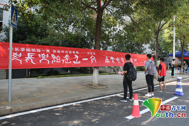 9月8日是湖南民族職業(yè)學院新生報到的日子,校園里掛滿了迎新橫幅。與其他學校的迎新橫幅不同的是,這里所有的橫幅內(nèi)容都采用甲骨文形式,吸引了不少師生駐足觀看。