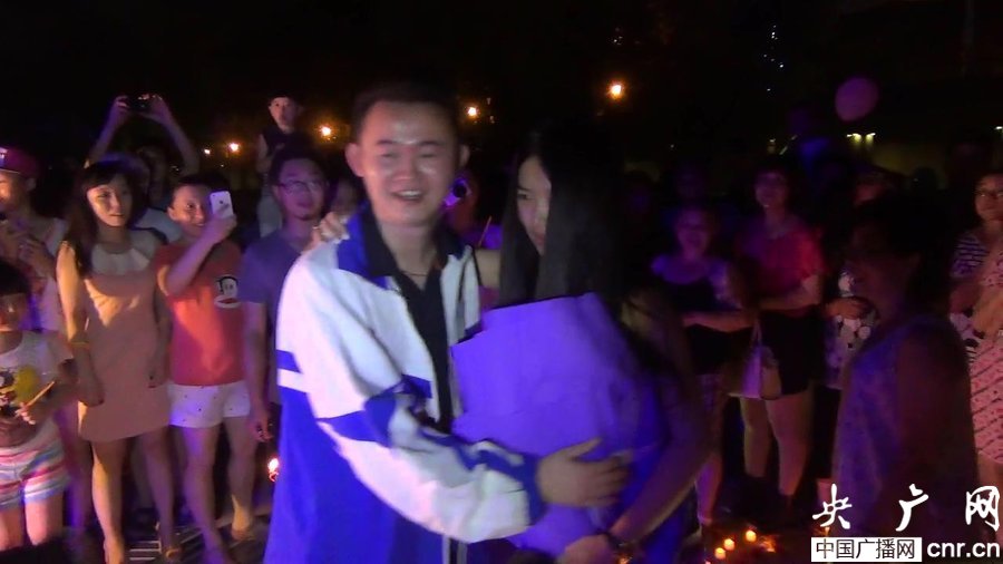 7月22日晚上8點28分,在南京鼓樓區(qū)濱江外灘廣場上演了浪漫的一幕:200根蠟燭擺出巨大的心形表達愛意,一旁碩大的“7.22”象征男主角毛先生女友的生日,周圍圍著一大幫親友。在閨蜜的引導(dǎo)下,被蒙上眼睛的女主角李小姐走下出租車,摘下眼罩的瞬間,事先毫不知情的她被這場面深深感動了,眼淚止不住流下來。